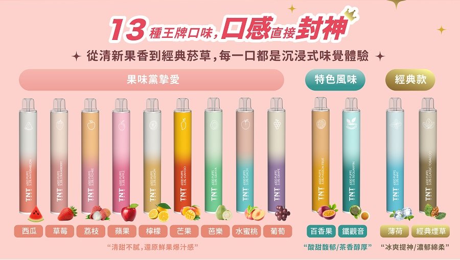 配備3.5%尼古丁含量,口感醇正適中,同時提供13種經典風味選擇:檸檬、荔枝、芭樂、經典菸草、芒果、百香果、蜜桃、薄荷、鐵觀音、西瓜、草莓、蘋果、葡萄,果香、草本、經典菸韻多元覆蓋,滿足不同口味偏好。